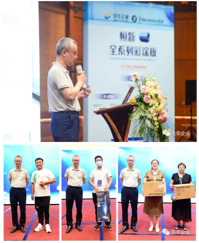 在接下來(lái)的一小時(shí)時(shí)間里,京華企業(yè)“恒新”品牌營(yíng)銷(xiāo)副總李明曄先生,從企業(yè)實(shí)力和品牌定位,新型鋅鋁鎂基材以及全系列“恒新”彩涂產(chǎn)品線(xiàn),“恒新”產(chǎn)品定制服務(wù)三方面向與會(huì)嘉賓做了全面的講解,全方位立體化向大家詳細(xì)闡述了“恒新”產(chǎn)品解決方案的獨(dú)特價(jià)值,以創(chuàng)新設(shè)計(jì)理念,幫助綠色建筑的節(jié)材,節(jié)水,節(jié)能,提升環(huán)境舒適度等各方面達(dá)成極大提升,以綠色理念幫助廣大客戶(hù)實(shí)現(xiàn)彩涂產(chǎn)品銷(xiāo)量的可持續(xù)增長(zhǎng)?,F(xiàn)場(chǎng)的客戶(hù)們表示認(rèn)可與支持,對(duì)于“恒新”品牌給用戶(hù)帶來(lái)的賦能升級(jí),轉(zhuǎn)型共生,給予了很高的期待! 隨后,李總就現(xiàn)場(chǎng)嘉賓提出的問(wèn)題做出了詳細(xì)解答,并隨機(jī)從提問(wèn)的嘉賓中抽取多名幸運(yùn)嘉賓,贈(zèng)與豐厚禮品,平板電腦、蒸汽拖把等大獎(jiǎng)一一揭曉,現(xiàn)場(chǎng)氣氛熱烈愉快。