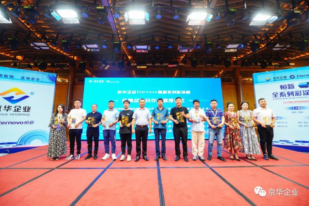 在現(xiàn)場(chǎng)300多位嘉賓的共同見(jiàn)證下,“恒新”品牌系列彩涂產(chǎn)品的經(jīng)銷(xiāo)商頒授儀式隆重舉行,京華企業(yè)總經(jīng)理陳鐵柱先生向聯(lián)合主辦會(huì)議的京津冀地區(qū)十二家經(jīng)銷(xiāo)商代表頒發(fā)了恒新品牌“合作共贏、共創(chuàng)未來(lái)”的授權(quán)牌,感謝大家長(zhǎng)期以來(lái)與公司戮力同心,持續(xù)提升著京華彩涂板在京津冀地區(qū)的行業(yè)標(biāo)桿形象。 京華企業(yè)與廣大客戶(hù)攜手共進(jìn),實(shí)現(xiàn)共贏共生,不斷創(chuàng)新與超越,努力鑄就綠色建材實(shí)力領(lǐng)先品牌,打造屬于整個(gè)金屬涂鍍行業(yè)的美好明天!