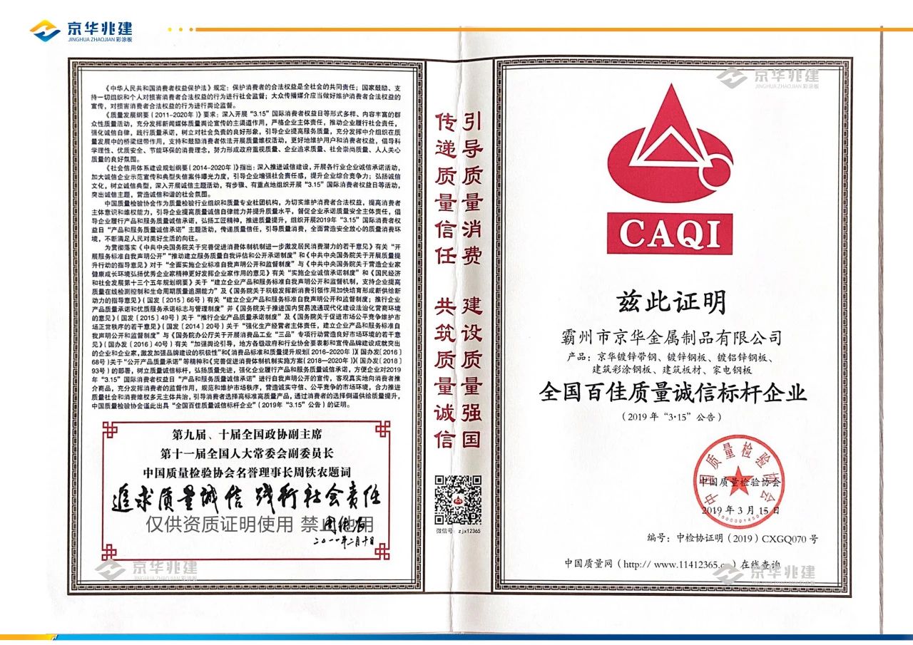 霸州京華金屬制品有限公司作為一家專業(yè)生產(chǎn)冷軋帶鋼、鍍鋅帶鋼、鋅鋁鎂帶鋼、冷軋鋼板、鍍鋁鋅鋼板、彩涂鋼板的現(xiàn)代化民營企業(yè),自創(chuàng)立以來,始終堅持創(chuàng)新,不斷擴大生產(chǎn)規(guī)模,通過了質(zhì)量管理體系ISO9001認證、歐盟CE認證等多項權(quán)威認證,且榮獲了“全國百佳質(zhì)量誠信標(biāo)桿企業(yè)”、“中國建材企業(yè)50強”、“重合同守信用企業(yè)”等多項榮譽。