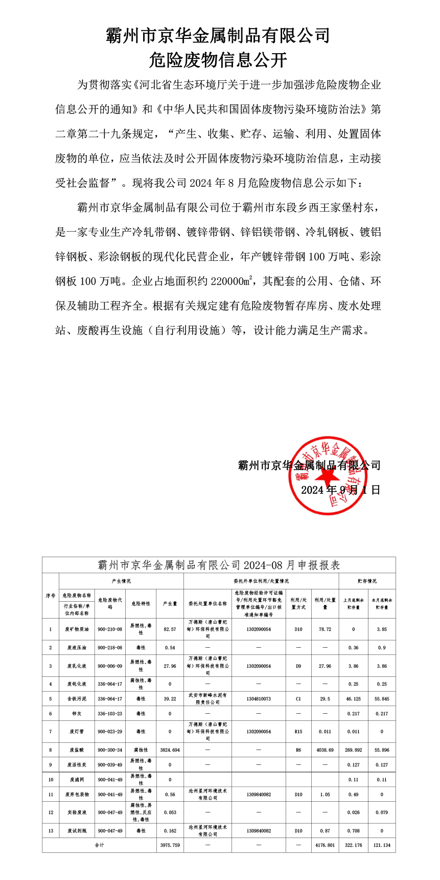 下一篇:24年9月危險(xiǎn)廢物信息公開(kāi)-霸州市京華金屬制品有限公司