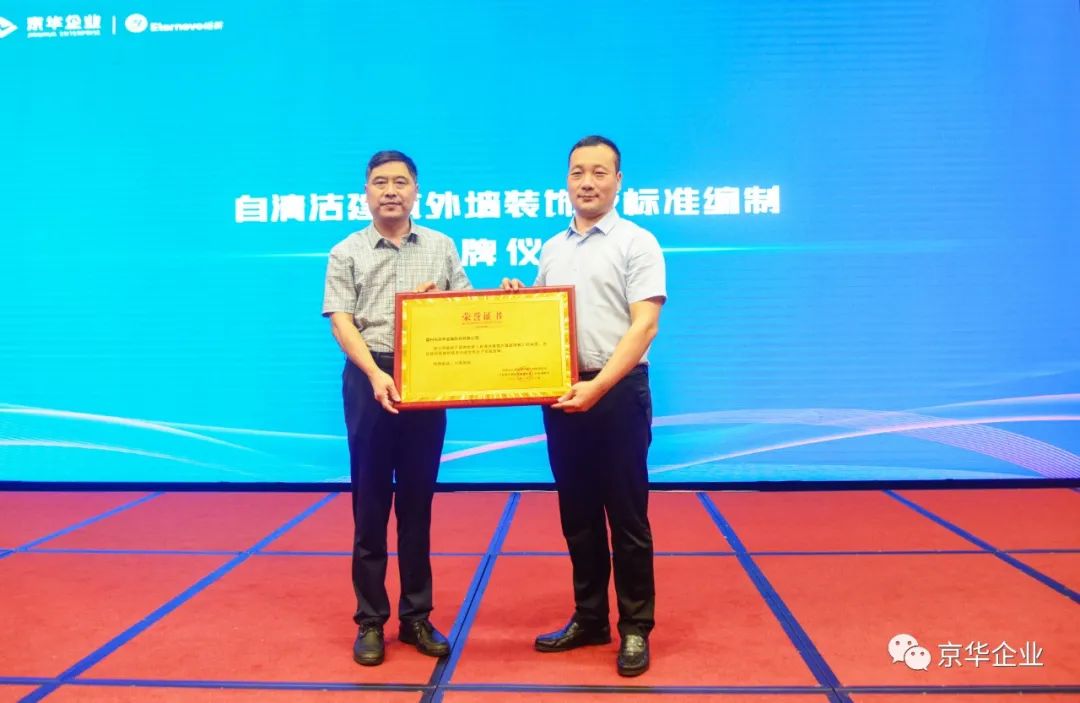 來(lái)自中國(guó)建材規(guī)劃院應(yīng)用技術(shù)開(kāi)發(fā)研究院/中關(guān)村人居環(huán)境工程與材料研究院副院長(zhǎng)王忠勇先生就綠色建筑及綠色建材課題向現(xiàn)場(chǎng)嘉賓進(jìn)行了分享,并向京華企業(yè)授予 “自清潔建筑外墻裝飾板標(biāo)準(zhǔn)編制” 榮譽(yù)牌,對(duì)京華企業(yè)參與建筑板材生產(chǎn)標(biāo)準(zhǔn)編制表示鼓勵(lì)與肯定。